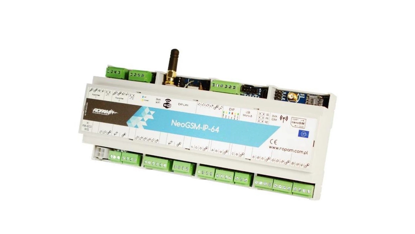 Centrala alarmowa NeoGSM-IP-64-PS-D12M, GSM + Wifi, 4 strefy, 16-64 wejść, 8-40 wyjść, 17-20VAC