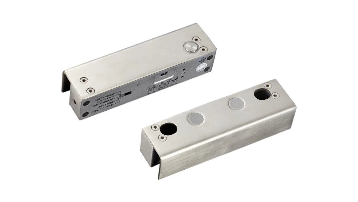 Elektrozamek trzpieniowy rewersyjny do witryn szklanych siła trzymania 1000 kg, sygnalizacja dioda LED, zwłoka czasowa, 12V DC