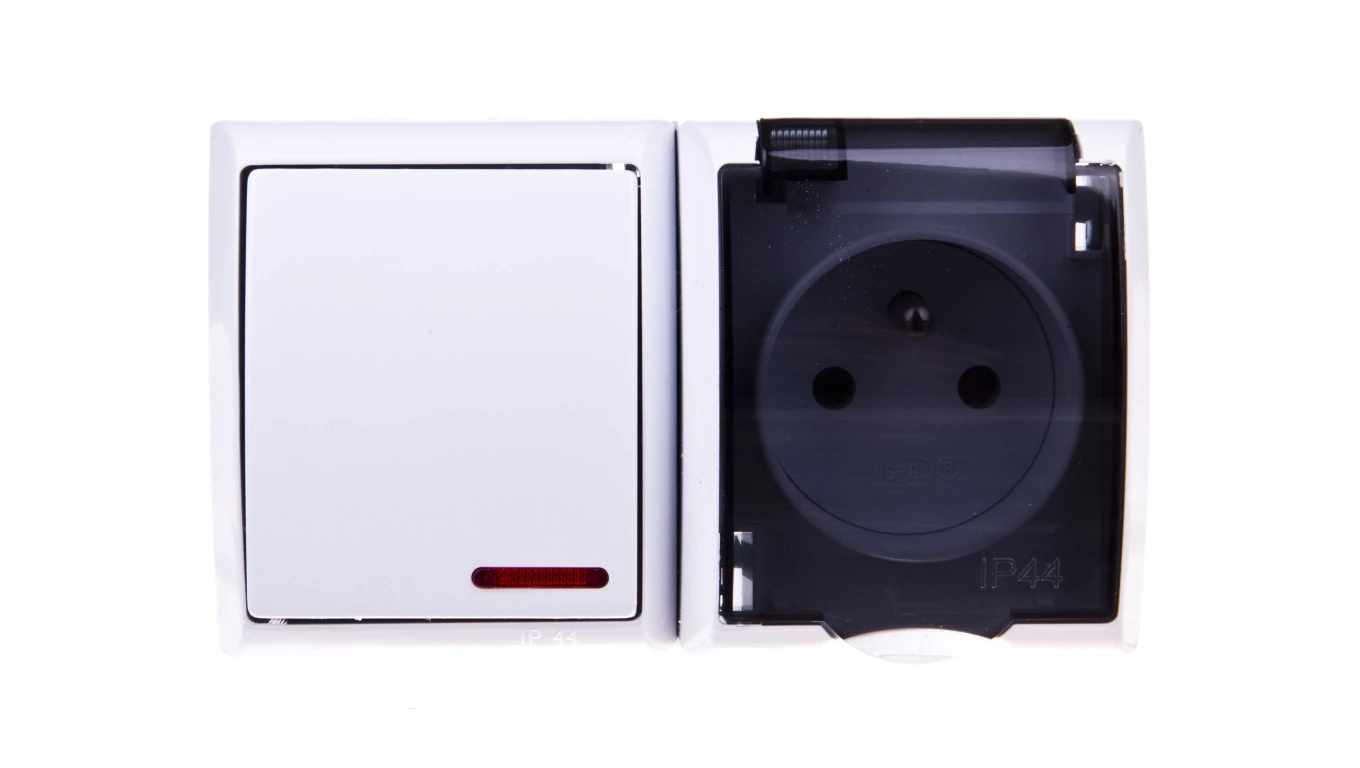 FALA Łącznik hermetyczny pojedynczy z podświetleniem + gniazdo z/u klapka przezroczysta białe ZH-Ł1SG/00/d