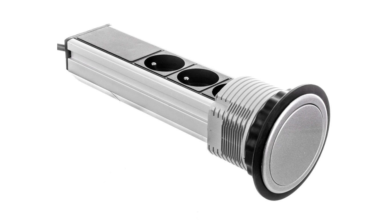 Gniazdo meblowe fi8cm, 3x250V AC wysuwane z blatu z przewodem 1,8m srebrne OR-AE-1355