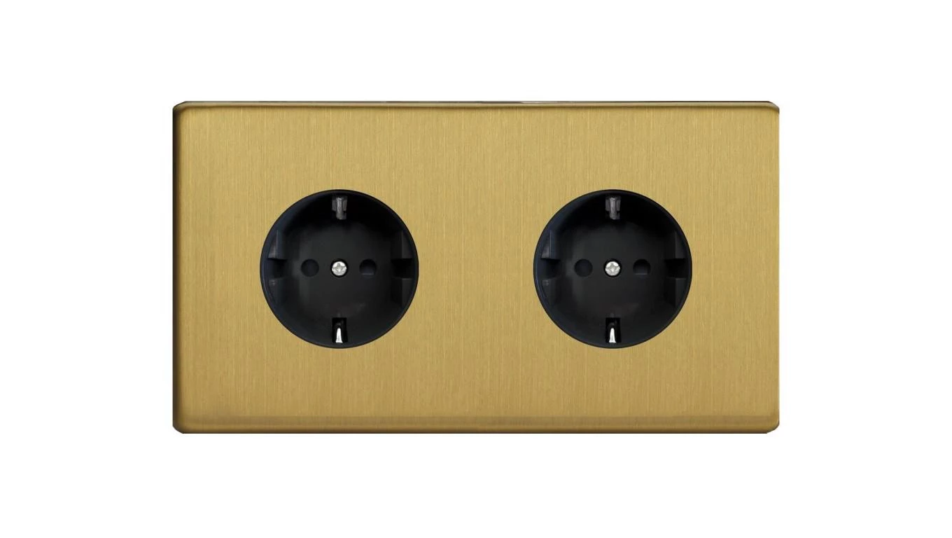 Gniazdo wtyczkowe podwójne z uziemieniem typu Schuko z przesłonami torów prądowych - kolor mosiądz szlifowany + kołnierz wewnętr