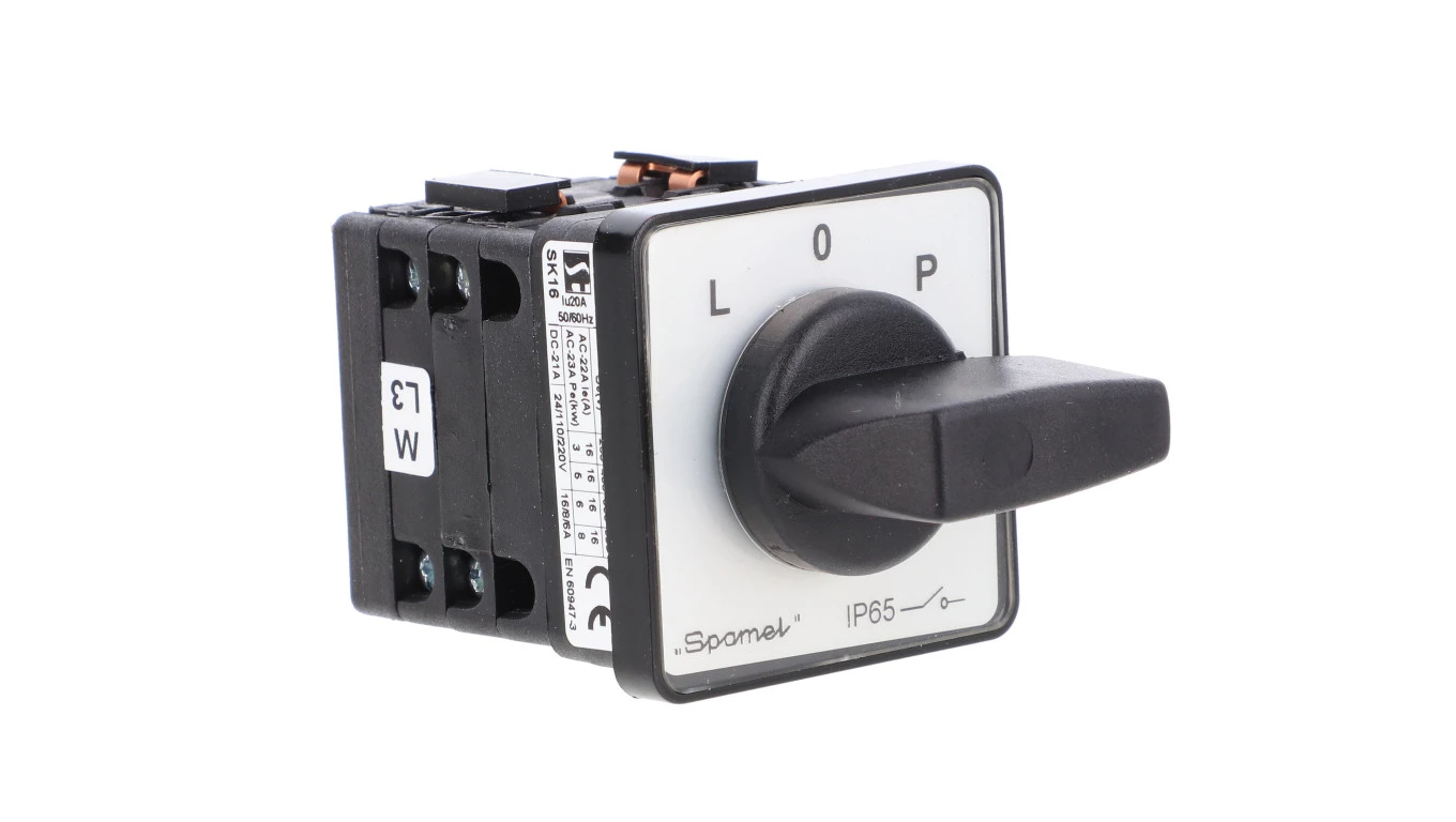 Łącznik krzywkowy 16A zmiana kierunku obrotów L-O-P pulpitowy czoło szare pokrętło czarne SK16-3.8368P03