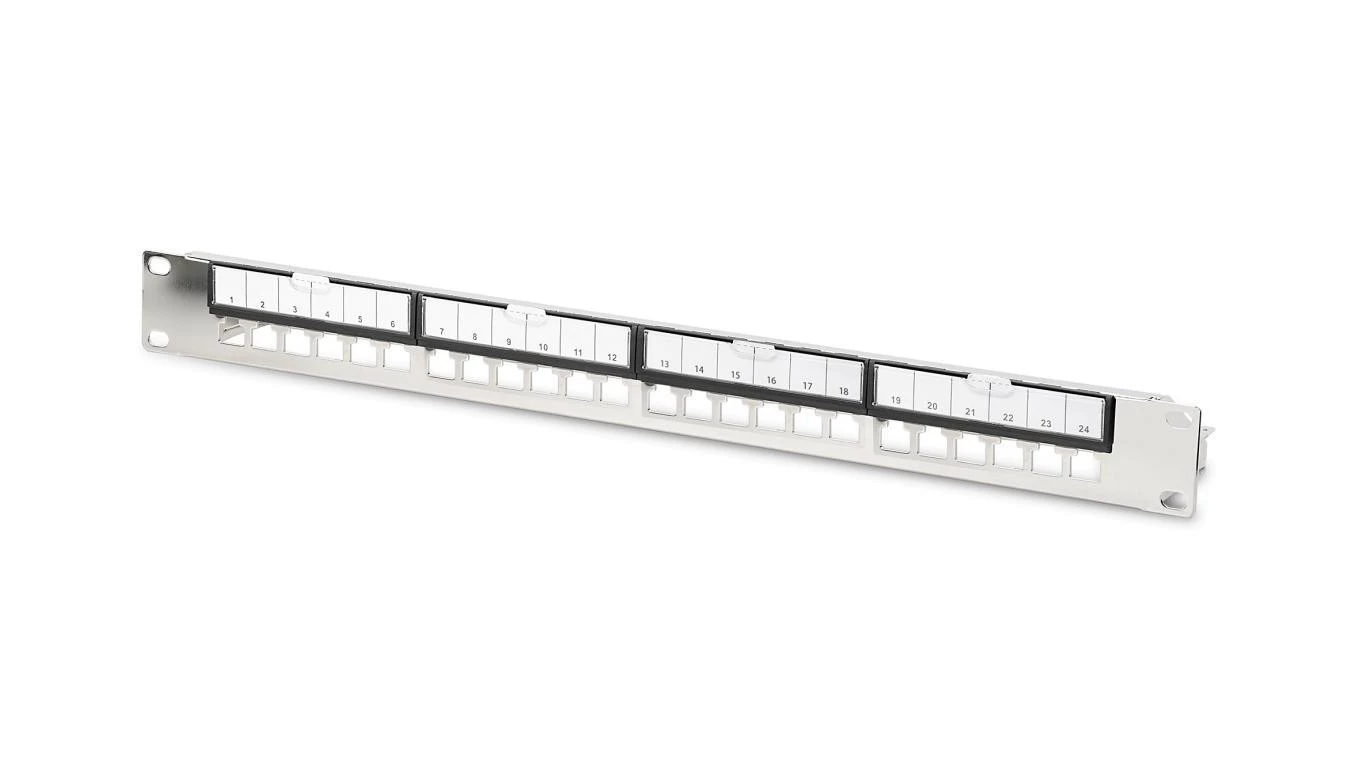 Panel krosowy modularny 19 24x keystone, ekranowany, 1U, srebrny, prowadnica kabli, wymienne pola opisowe, galwaniz DN-91411-G