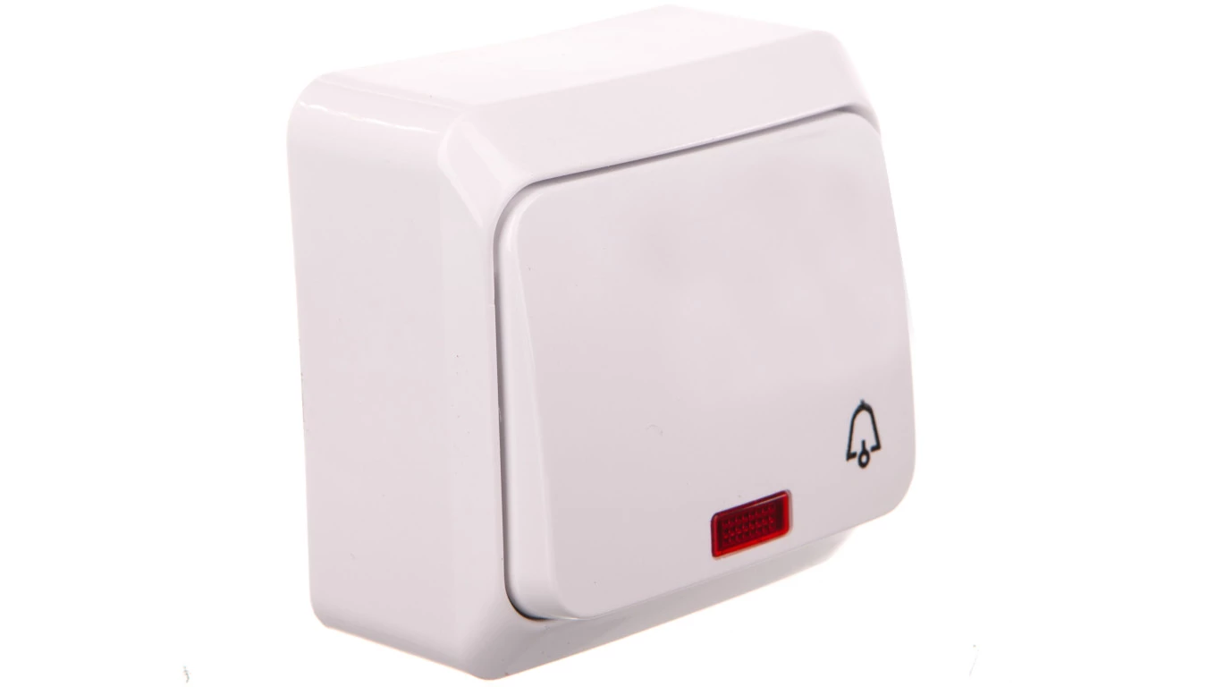 Łącznik natynkowy jednobiegunowy zwierny "dzwonek" z podświetleniem, biały PRIMA o numerze katalogowym WDE001015 w kategorii Przyciski natynkowe dzwonkowe, Przyciski dzwonkowe. Produkt wyprodukowany przez markę SCHNEIDER ELECTRIC, seria PRIMA.