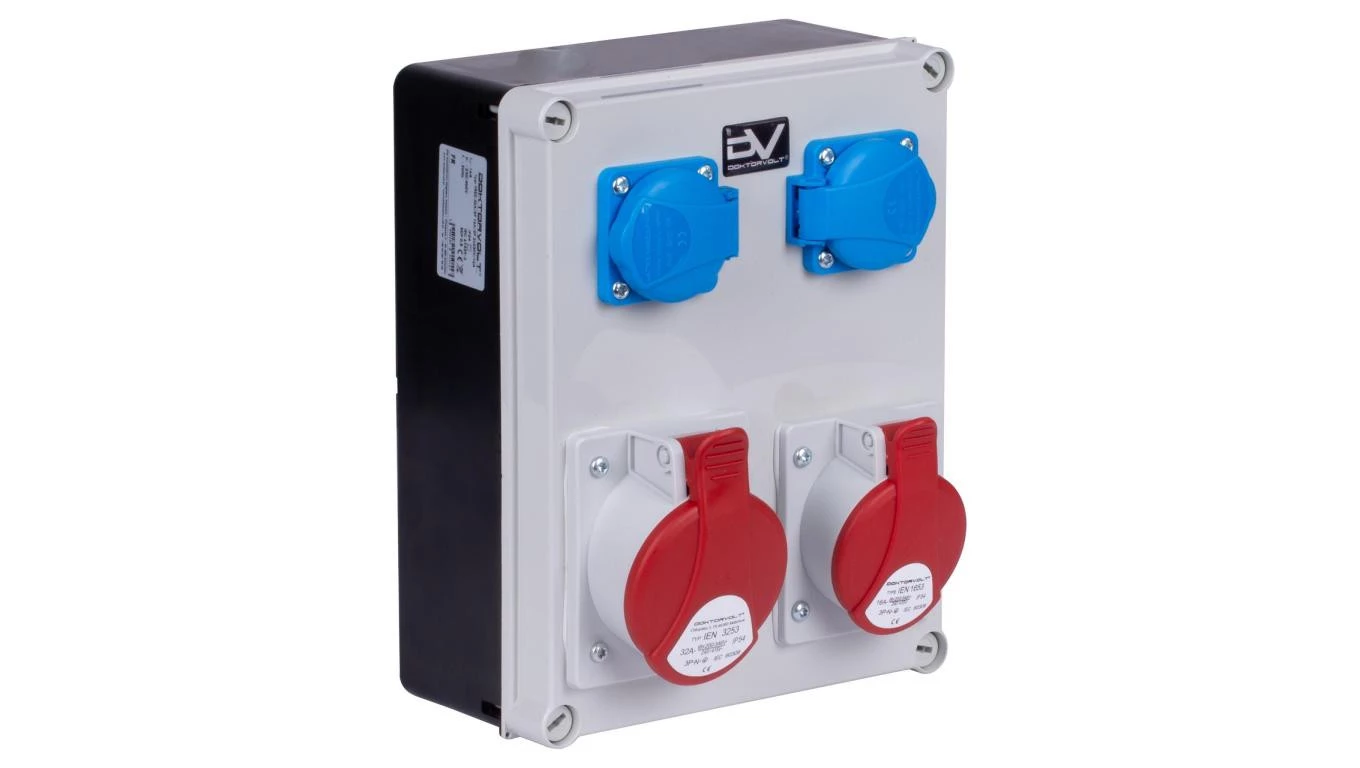 Rozdzielnica budowlana FRED hermetyczna IP54 + 2x gniazdo siłowe 5P (400V 32A + 16A) + 2x gniazdo 2P+Z (230V 16A) DOKTORVOLT DV-