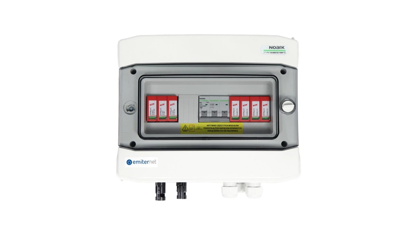 Rozdzielnica DC/AC hermetyczna EMITER z ogranicznikiem przepięć DC Dehn 1000V typu 2, 1 x łańcuch PV, 1 x MPPT, ogranicznik AC typ 2, B16A 3F o numerze katalogowym EM-40_DCAC w kategorii Obudowy, Zabezpieczenie instalacji. Produkt wyprodukowany przez markę EMITER, seria ZABEZPIECZENIE INSTALACJI.