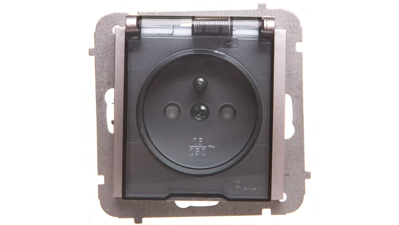 Sentia Gniazdo bryzgoszczelne z/u IP44 z klapką transparentną z przesłonami srebrny połysk 1466-56