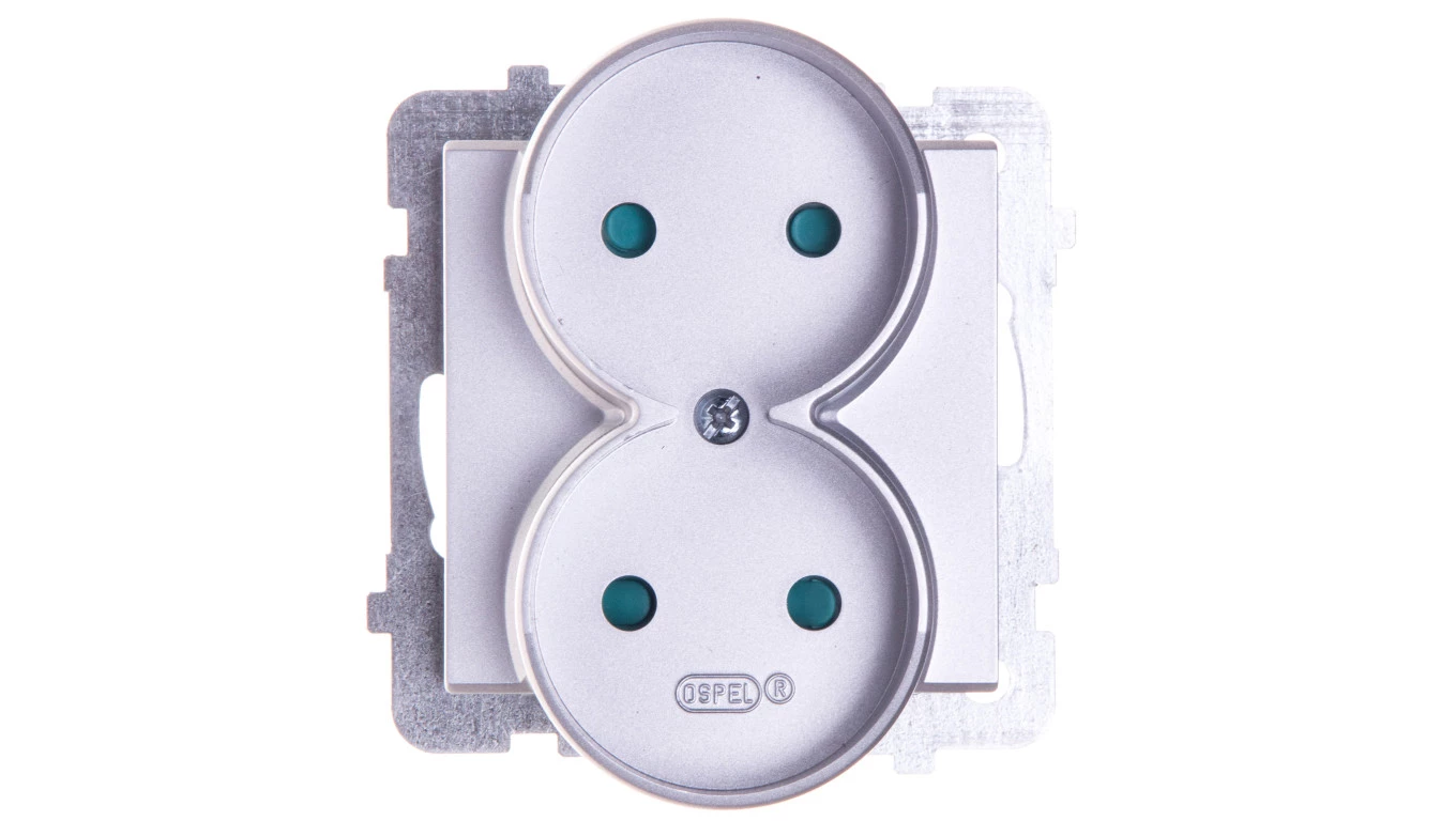 Gniazdo podwójne z przesłonami torów prądowych, srebro mat SONATA o numerze katalogowym GP-2RRP/M/38 w kategorii Gniazda podtynkowe, Gniazda instalacyjne. Produkt wyprodukowany przez markę OSPEL, seria SONATA.