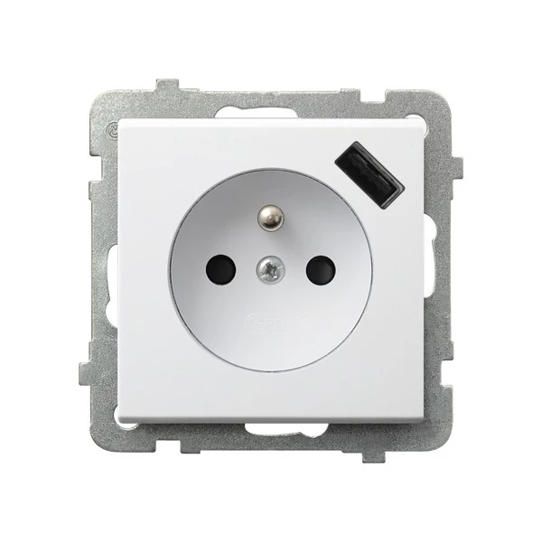 SONATA Gniazdo pojedyncze z uziemieniem z przesłonami torów prądowych, z ładowarką USB biały mat GP-1RZPUSB/m/75