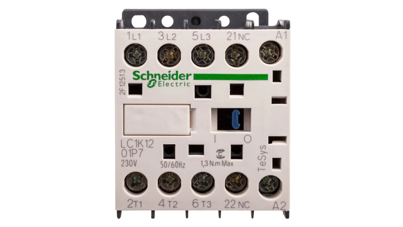 Stycznik mocy TeSys K AC3 12A 3P 1NC cewka 230VAC zaciski skrzynkowe o numerze katalogowym LC1K1201P7 w kategorii Styczniki typ AC, Styczniki. Produkt wyprodukowany przez markę SCHNEIDER ELECTRIC.