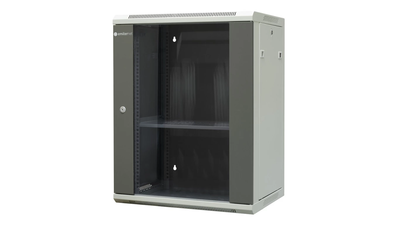 Szafa wisząca niedzielona 19 15U, drzwi blacha/szkło, ściągane osłony boczne z zamkiem, 600×450×770 szer./gł./wys. mm RAL: sza