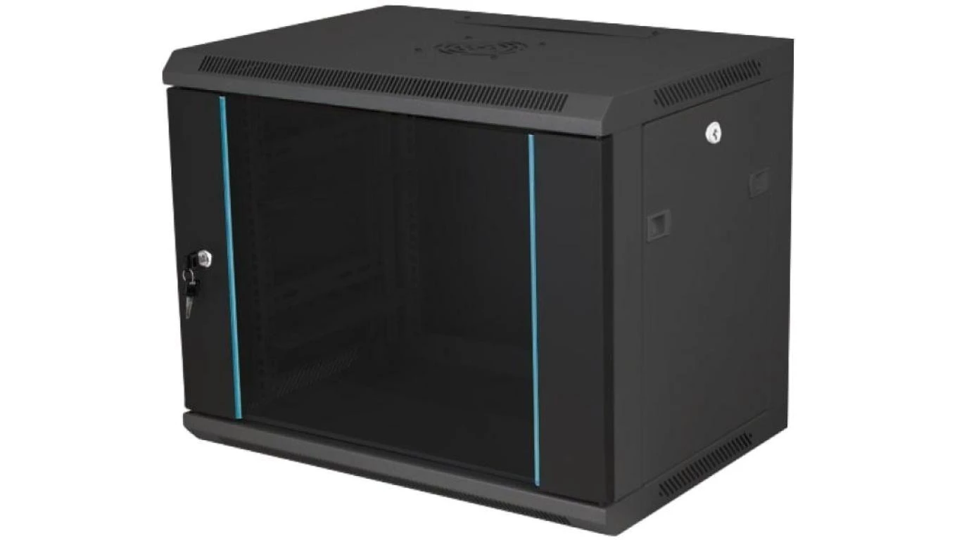 Szafka rack wisząca 19 18U 600x450, niedzielona, drzwi szklane jednoskrzydłowe, kolor czarny FLAT PACK SW-18U-600-450-N-DSJ-OP-R