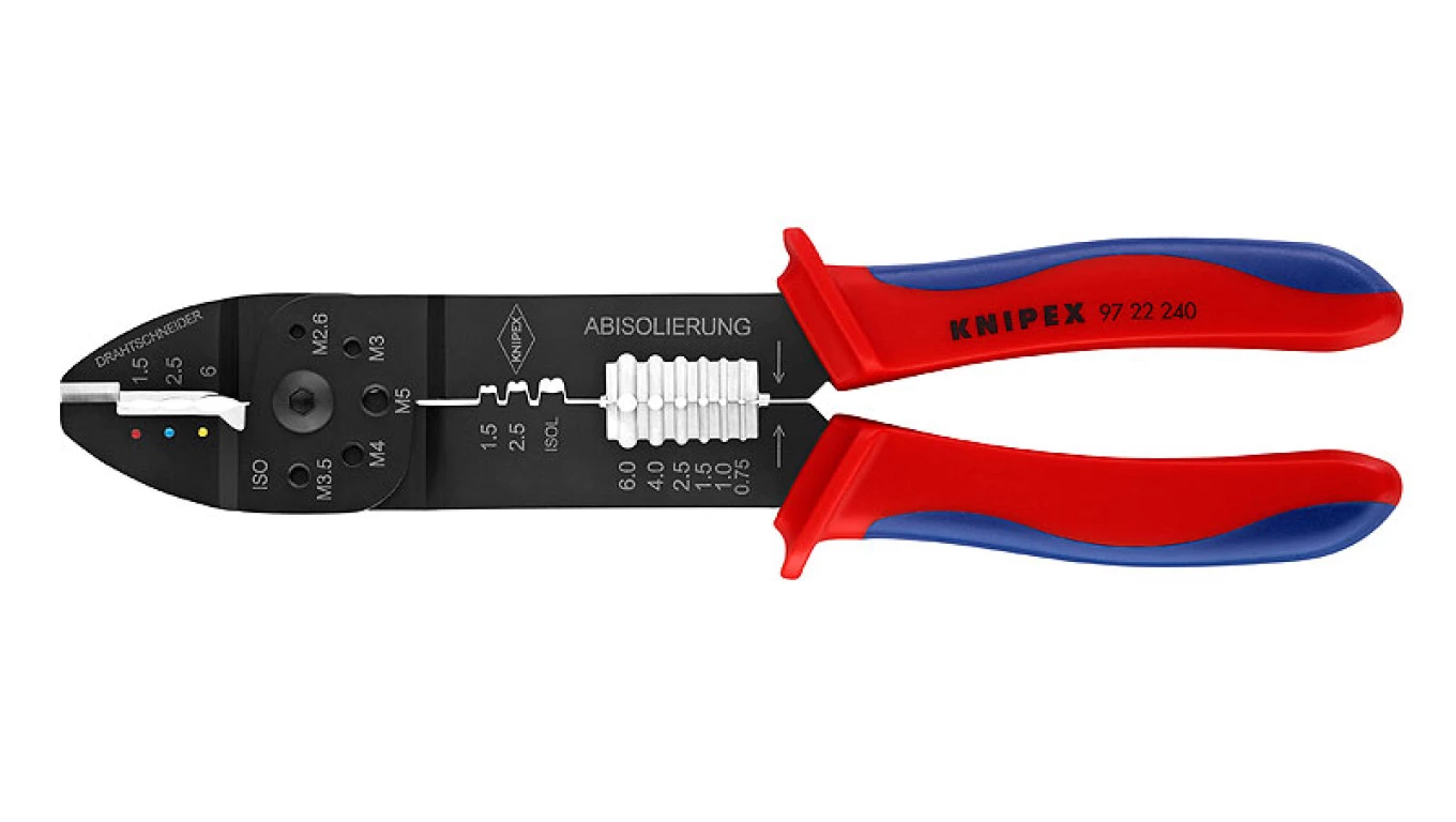 Szczypce do zagniatania z wielokomponentowymi nasadkami lakierowana w kolorze czarnym 240 mm o numerze katalogowym   97 22 240 w kategorii Wkrętaki i szczypce>Szczypce. Produkt wyprodukowany przez markę KNIPEX, seria SZCZYPCE.