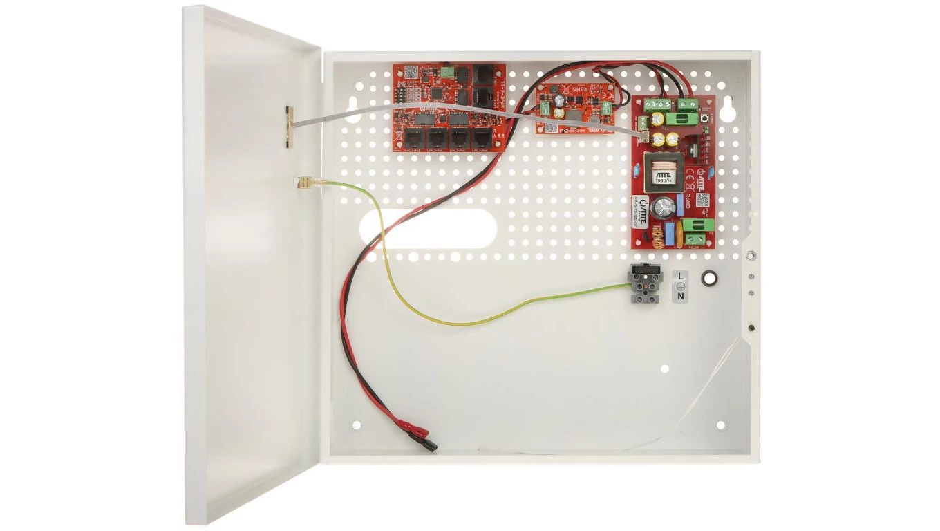 Zestaw buforowy do 5 kamer IP switch PoE 5P+1UP w obudowie wewnętrznej ABOX-F (1x AKU 18Ah), zasilacz 72W