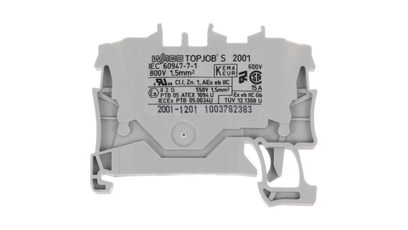 Złączka 2-przewodowa przelotowa 1,5 mm do zastosowań Ex e II opis z boku i na środku na szynę TS 35 x 15 i 35 x 7,5 Push-in CAGE CLAMP 1,50 mm szara o numerze katalogowym 2001-1201 w kategorii Złączki i zaciski ochronne sprężynowe, Złączki listwowe sprężynowe. Produkt wyprodukowany przez markę WAGO, seria TOPJOB® S.