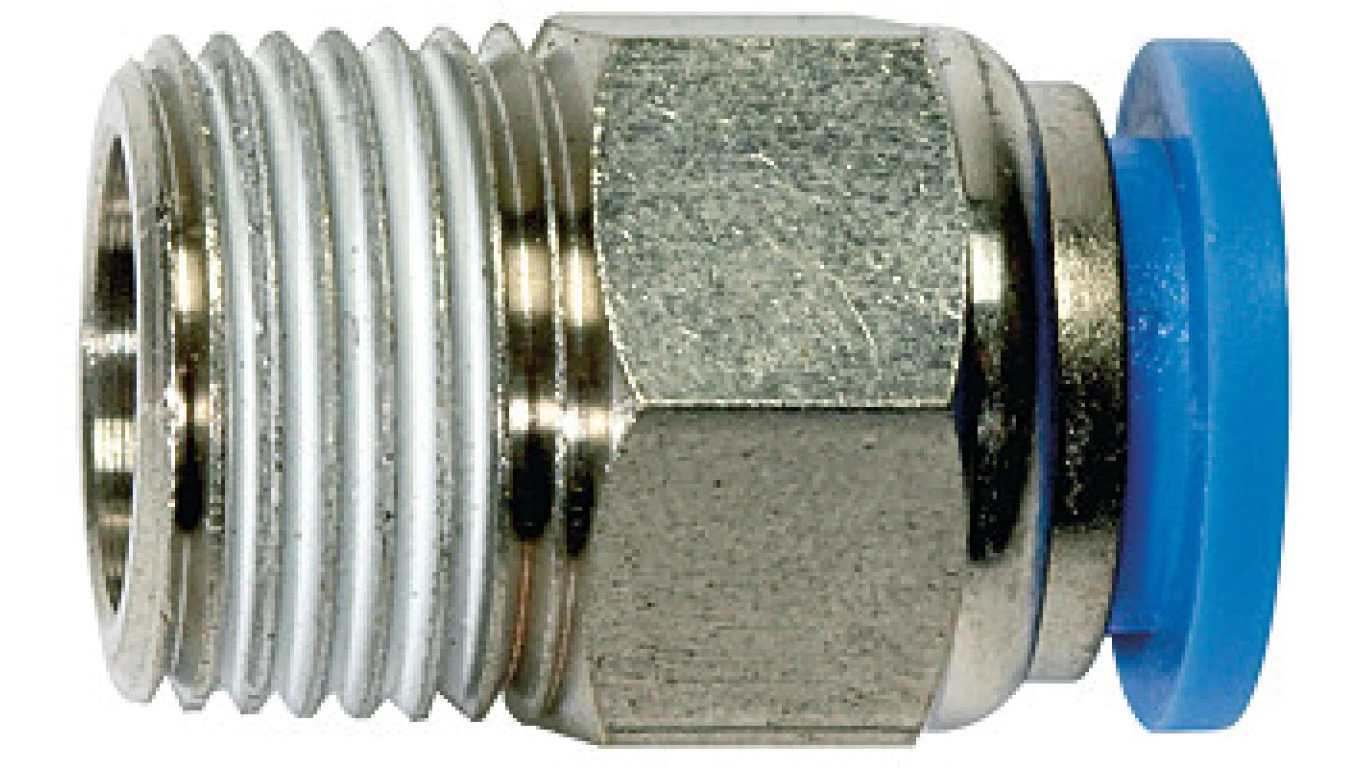 Złączka wtykowa prosta mosiężna niklowana do węża 10, gwint zewnętrzny stożkowy R1/4z, 123.014-10