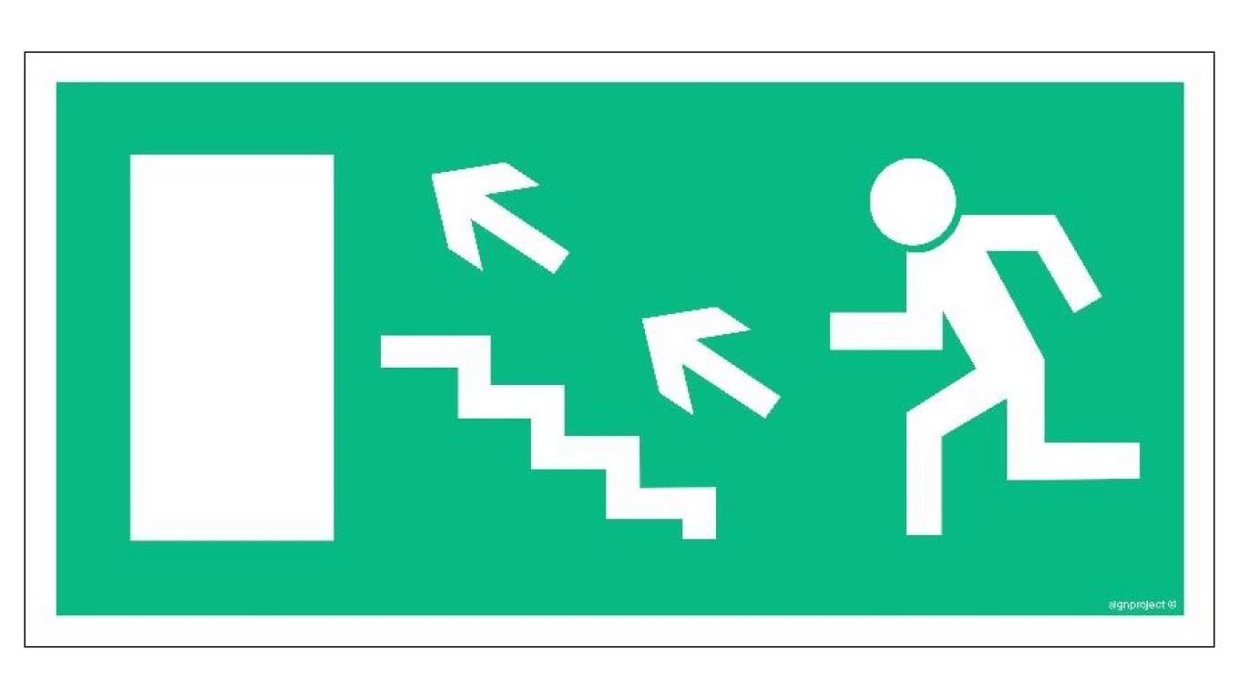 ZNAK - AC019 Wyjście ewakuacyjne w lewo schodami w górę 30 x 15 cm KS - Folia podłogowa foto.