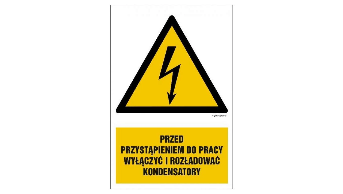 ZNAK - HA018 Przed przystąpieniem do pracy wyłączyć i rozładować kondensatory 15 x 22,5 cm PN - Płyta 1mm