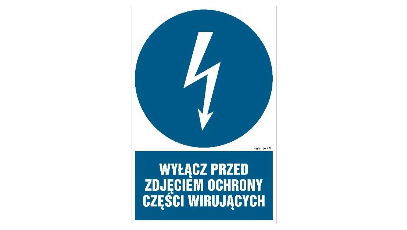 ZNAK - HE015 Wyłącz przed zdjęciem ochrony wirujących części 7,5 x 10 cm FN - Folia samoprzylepna