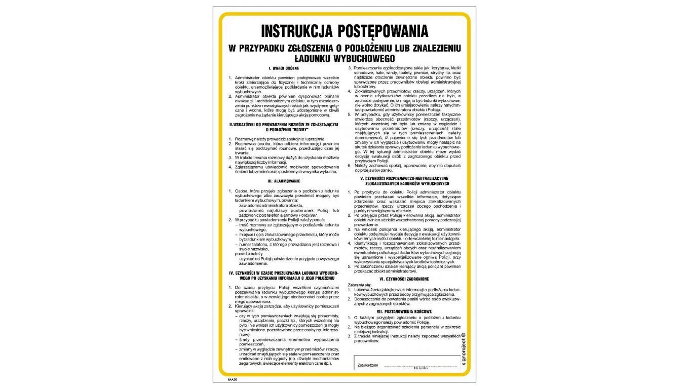ZNAK - IAA30 Instrukcja postępowania w przypadku zgłoszenia o podłożeniu lub znalezieniu ładunku wybuchowego 24,5 x 35 cm FN - F