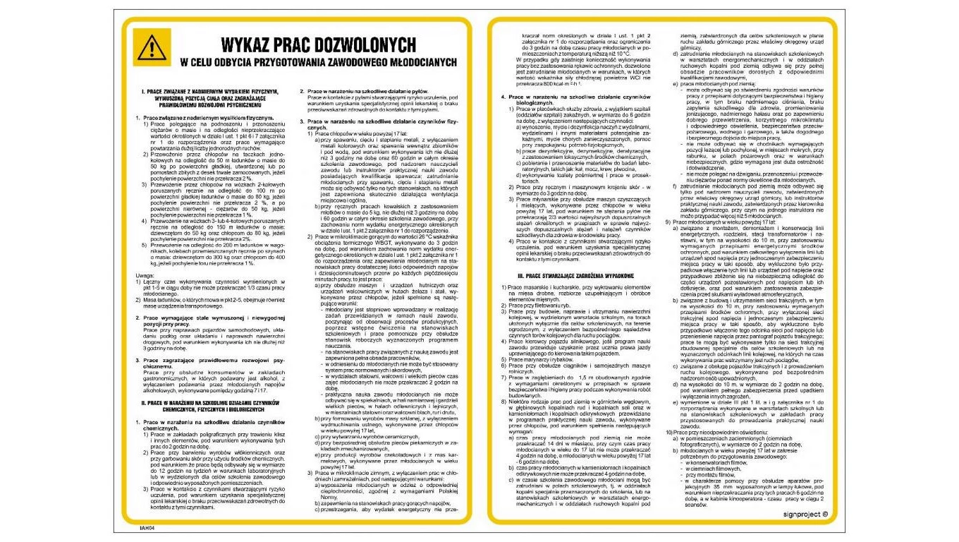ZNAK - IAH04 Wykaz prac dozwolonych w celu odbycia przygotowania zawodowego młodocianych 49 x 35 cm HN - Płyta TD-flex 0,4mm