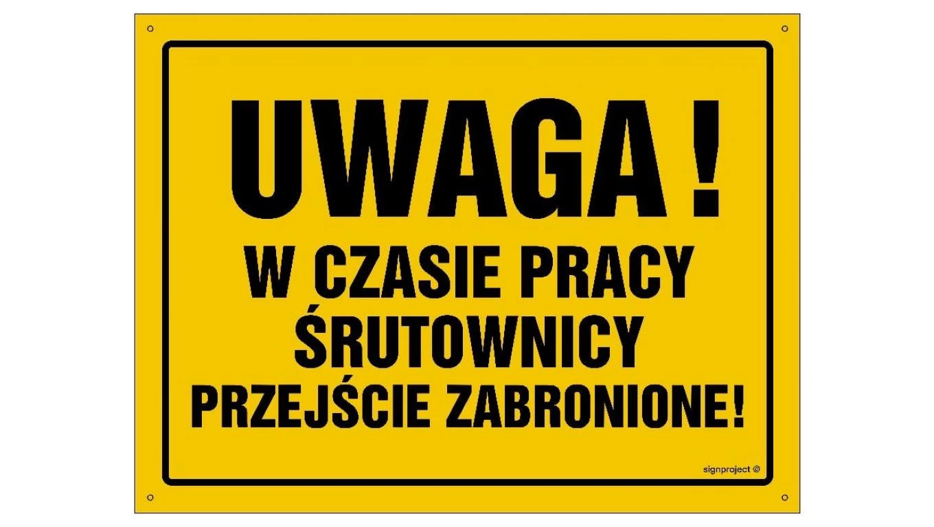 ZNAK - OA027 Uwaga! W czasie pracy śrutownicy przejście zabronione 45 x 32 cm BN - Płyta żółta 0,6mm