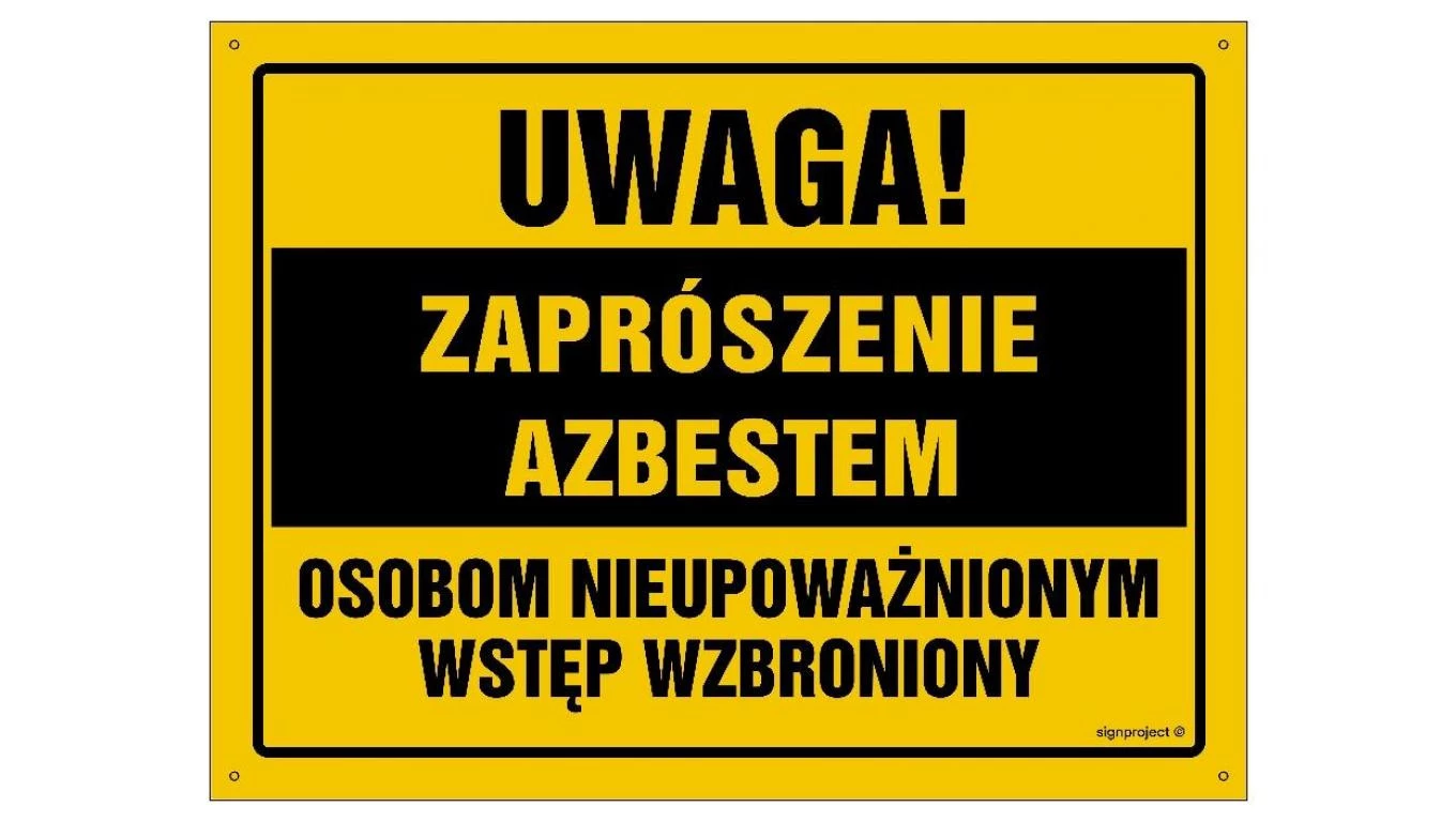 ZNAK - OA103 Uwaga! Zaprószenie azbestem Osobom nieupoważnionym wstęp wzbroniony 60 x 43 cm BN - Płyta żółta 0,6mm