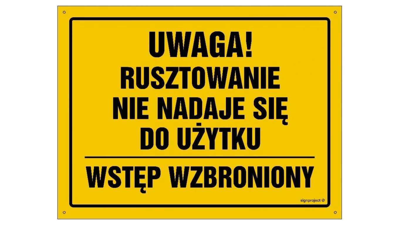 ZNAK - OA144 Uwaga! Rusztowanie nie nadaje się do użytku Wstęp wzbroniony 45 x 32 cm FN - Folia samoprzylepna