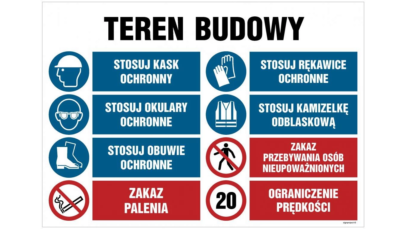 ZNAK - OI017 Teren budowy, Przed rozpoczęciem pracy podpisz się na liście obecności, Stosuj kamizelkę odblaskową 100 x 75 cm PN